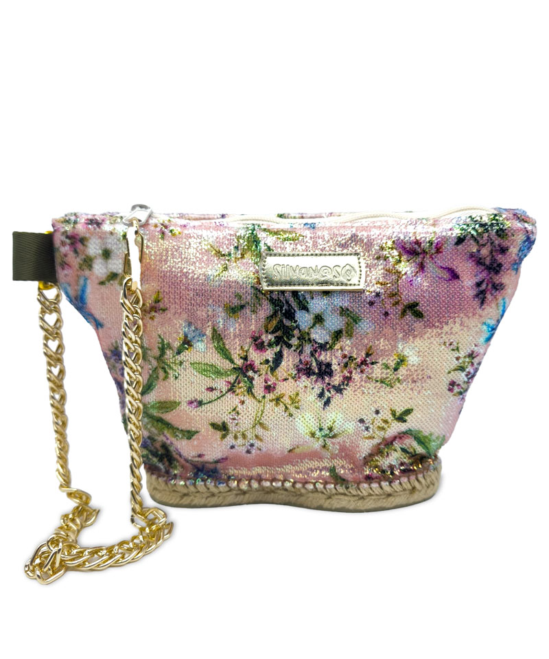 Bolso artesanal de estilo romántico, con un delicado estampado floral sobre fondo rosado. Su base de yute natural aporta un toque natural y autentico, mientras que la cadena dorada le da un aire elegante y sofisticado.